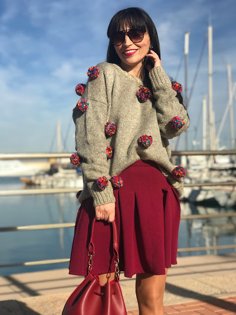 La minifalda es de vuelo y tiene un movimiento espectacular, además nunca había tenido una falda en color burdeos y me ha encantado porque es una tonalidad muy versátil. Pero sin duda la pieza estrella es el jersey con pompones multicolor que es una pasada no sólo por el detalle de pompones sino porque es muy suave y de una calidad excelente.