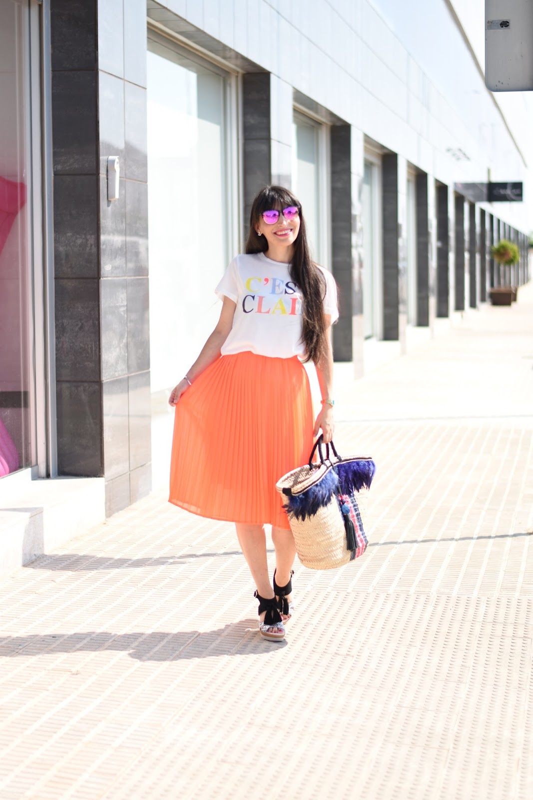 Es especial sobretodo por la preciosa falda plisada en tono flúor que aporta una gran inyección de energía al look, sin duda se convierte en una gran aliada para este verano y combinándola con una camiseta me parece una opción perfecta para lucir de forma casual chic.