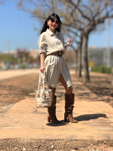 Nada más lo vi me recordó a los estilismos de estilo Safari con vestido midi camisero en tejido rústico y es por eso que le añadí accesorios a juego potenciando este tipo de tendencia y creo que ha quedado un look muy favorecedor y como digo yo: MUY "MEMORIAS DE ÁFRICA".