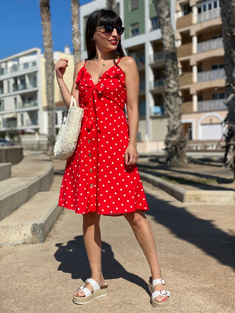 Buenos días bloggnautas quien me conoce bien sabe la pasión que tengo por el color rojo y sobretodo por los vestidos de lunares en verano... Sin duda alguna este vestido aúna ambas cosas y si le sumas los detalles de la lazada, los volantes y la falda abotonada viene siendo mi vestido más idolatrado.